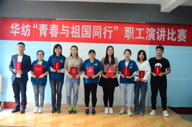 9月19日,公司舉辦了主題為“青春與祖國同行”的職工演講比賽活動,經過預賽、復賽程序進入最后決賽的九位選手,在比賽中用款款深情的講述,詮釋了華紡員工熱愛祖國、傾心事業的情懷。