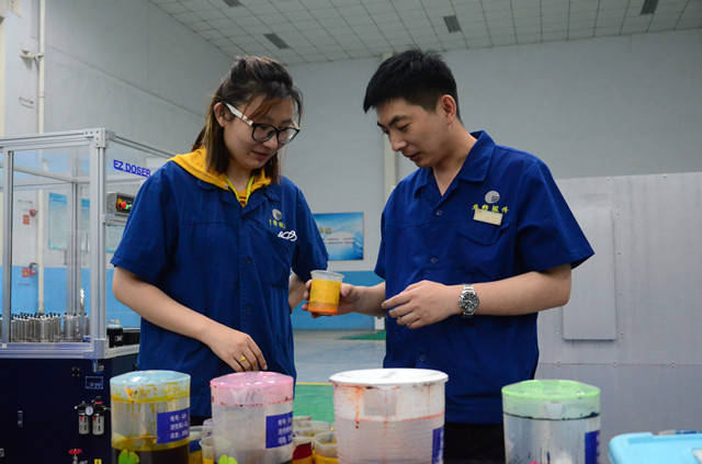 張?zhí)鹛穑▓D左)和張新華(圖右)二人,是多年來在公司花布車間從事專業(yè)技術(shù)工作的基層科技工作者,他們每天都為車間生產(chǎn)的印花產(chǎn)品精心調(diào)制著顏色。與其二人一樣,公司從事顏色調(diào)配的專業(yè)技術(shù)人員,每天都要完成一定數(shù)量的顏色調(diào)制;以花布車間為例,每人每天完成顏色調(diào)制在15-30個之間,并符合四級以上印花符樣標(biāo)準(zhǔn)。他們用自己的堅守與付出,演繹著一道旖旎多彩的風(fēng)景線。