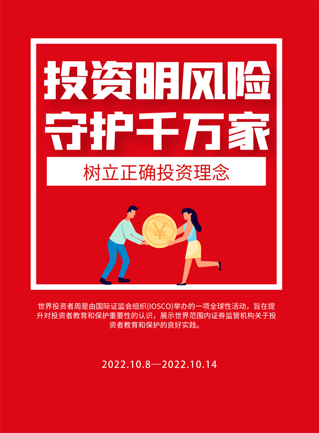2022年“世界投資者周”將圍繞“投資明風(fēng)險(xiǎn),守護(hù)千萬家”主題,向投資者普及《期貨和衍生品法》、普及綠色金融、綠色投資理念,引導(dǎo)投資者閱讀上市公司定期報(bào)告、踐行以信息披露為核心的注冊(cè)制理念,向投資者傳播金融證券知識(shí),提示投資風(fēng)險(xiǎn),增強(qiáng)理性投資、價(jià)值投資、長期投資、風(fēng)險(xiǎn)防范意識(shí),引導(dǎo)投資者樹立正確投資理念。