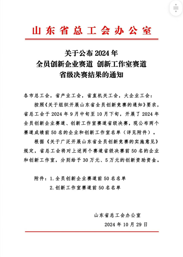 近日,山東省總工會公布了2024年全員創(chuàng)新企業(yè)賽道、創(chuàng)新工作室賽道名單,在全員創(chuàng)新企業(yè)賽道,公司成功入選!