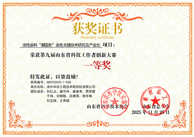 近日,在第九屆山東省科技工作者創新大賽決賽中,公司工程技術研究院團隊研發的“活性染料‘潮固色’染色關鍵技術研究及產業化”項目,經多輪嚴格評審,從282個入圍決賽的優秀項目中脫穎而出,榮獲大賽一等獎。