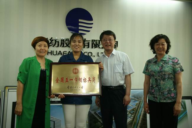 日前,濱州市總工會常務(wù)副主席耿慶東、副主席趙敏、女工部部長左麗華一行來到公司,為榮膺“全國五一巾幗標(biāo)兵崗”的服裝車間縫制工段代授獎牌,并與該工段主管李艷艷進行了簡短的工作座談,公司副總經(jīng)理邱淑芳、工會主席鄭安江參加授牌與座談。
