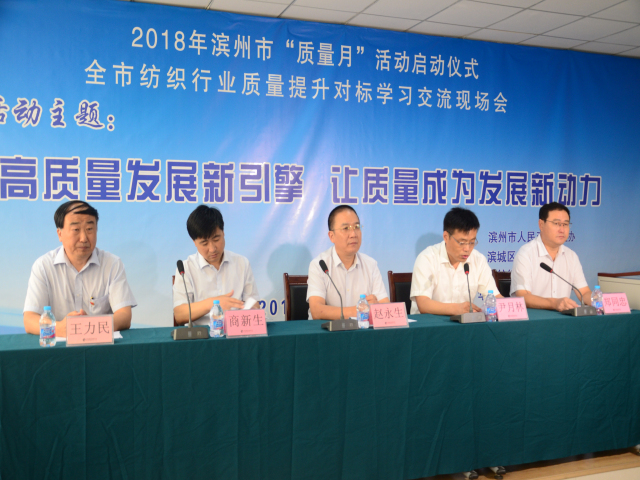 9月5日,2018年濱州市“質量月”活動啟動儀式暨全市紡織行業(yè)質量提升對標學習交流現(xiàn)場會在公司科技產業(yè)園舉行,會議由市政府秘書長尹月林主持,副市長、公安局長趙永生,市質監(jiān)局黨委書記商新生,濱城區(qū)副區(qū)長鄭同忠,公司黨委書記、董事長王力民出席啟動儀式。